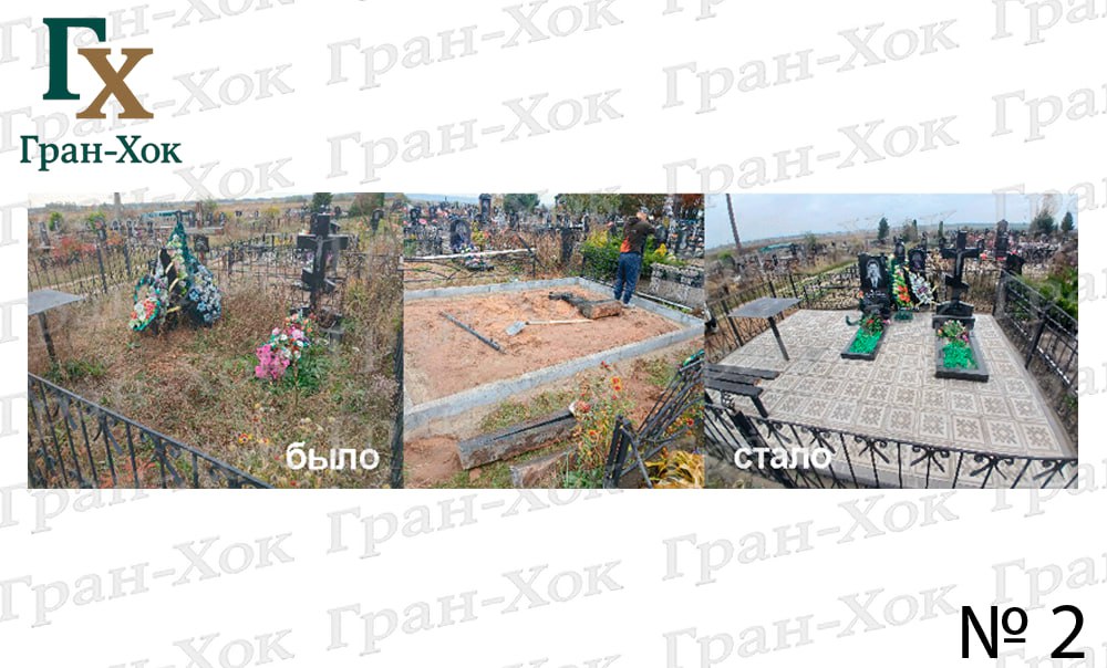 Утилизация высокой травы, выравнивание участка, укладка плитки, установка борта, демонтаж и установка гранитного креста, ограды, стола, лавочки и ограды.