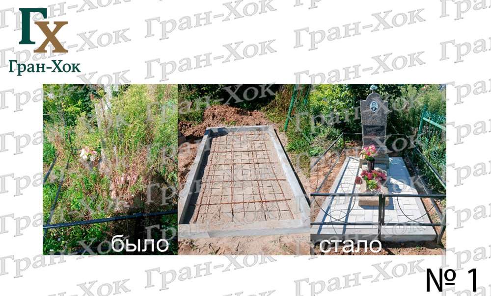 Утилизация высокой травы, выравнивание участка, укладка плитки, установка борта, демонтаж и установка старого памятника и ограды.